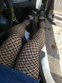 今日は久しぶりにベージュパンストにアミタイツを重ね履きしてドライブしてます。